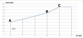 户外温度补偿控制是根据户外温度的变化,由控制器通过计算,自动算出二次网对应的 供水温度,然后通过自动调整一次网进口的电动温度调节阀开度来控制一次网热源的流 量。从而达到自动控制二次网供水温度的目的。这样既能保护供暖用户的室内温度,又 能达到节省能源的目的。户外温度补偿的设定分为两段,A,B,C三个温度控制计算点, 控制斜率不同。兼顾舒适感和节能效果。A、B、C三点的温度设定值一定要按C>B>A的原 则进行设定。在户外温度补偿控制模式下,二次网的供水控制温度值不能进行设定。此 时的温度设定值是控制器根据户外温度值自动计算出来,户外温度越低,二次网的供水 温度越高。 |